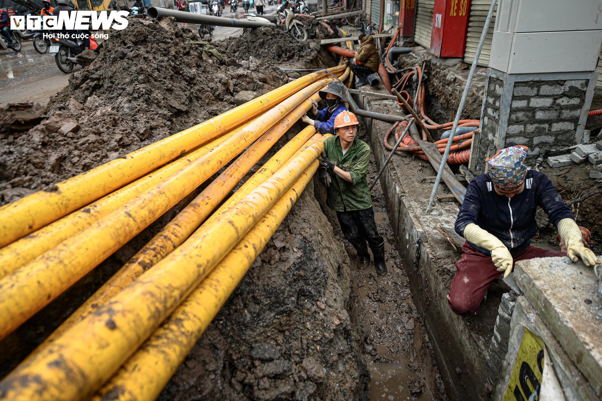 Những ngày này, trên công trường đoạn từ Nguyễn Trãi đến ngõ 162 Nguyễn Tuân, hàng chục công nhân cùng máy móc được huy động để thi công hệ thống thoát nước và hạ ngầm cáp kỹ thuật.