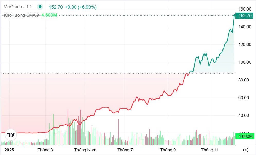 Báo cáo giao dịch cho thấy, trong giai đoạn từ 28/11–4/12, các tổ chức nội đã mua ròng hơn 6.100 tỷ đồng cổ phiếu này. Sang phiên 5/12, lực mua từ nhà đầu tư cá nhân tiếp tục nối đà, giúp cổ phiếu duy trì trạng thái ổn định và trở thành nhóm dẫn dắt nhịp tăng của thị trường chung.