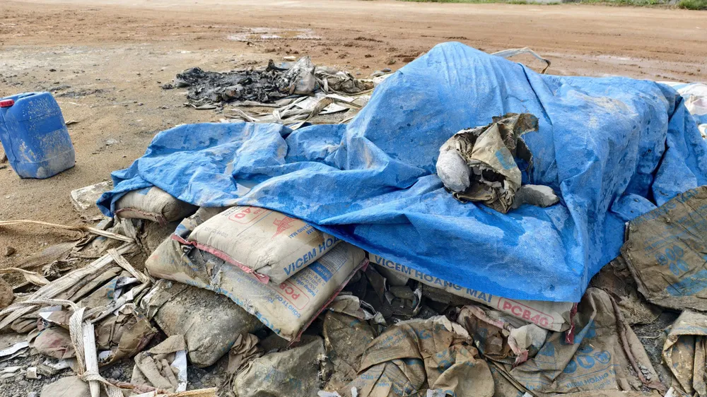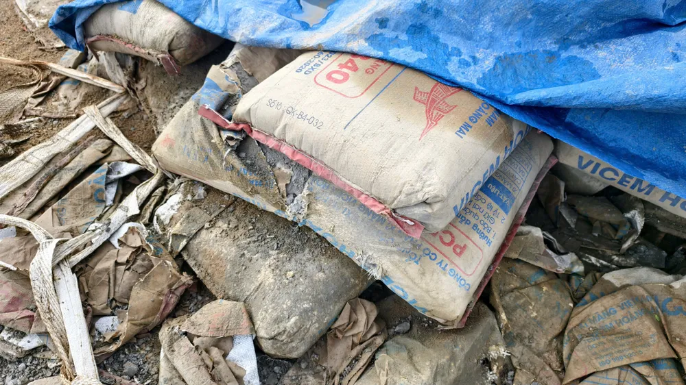 Ngay một điểm giữa công trình có một đống xi măng lớn được che chắn sơ sài bằng tấm nhựa đã bị xô lệch ra bên ngoài, mưa ướt dẫn đến khô cứng, không thể sử dụng.