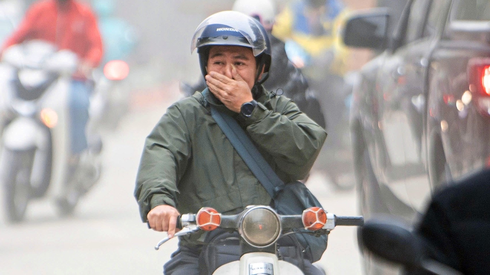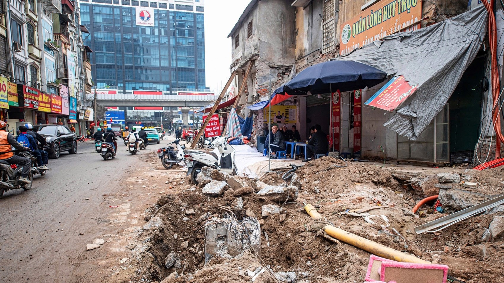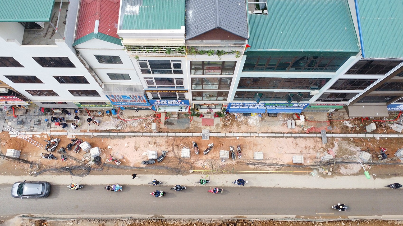 Vật liệu xây dựng được tập kết ngay trên lòng đường, khiến các phương tiện phải di chuyển chậm.