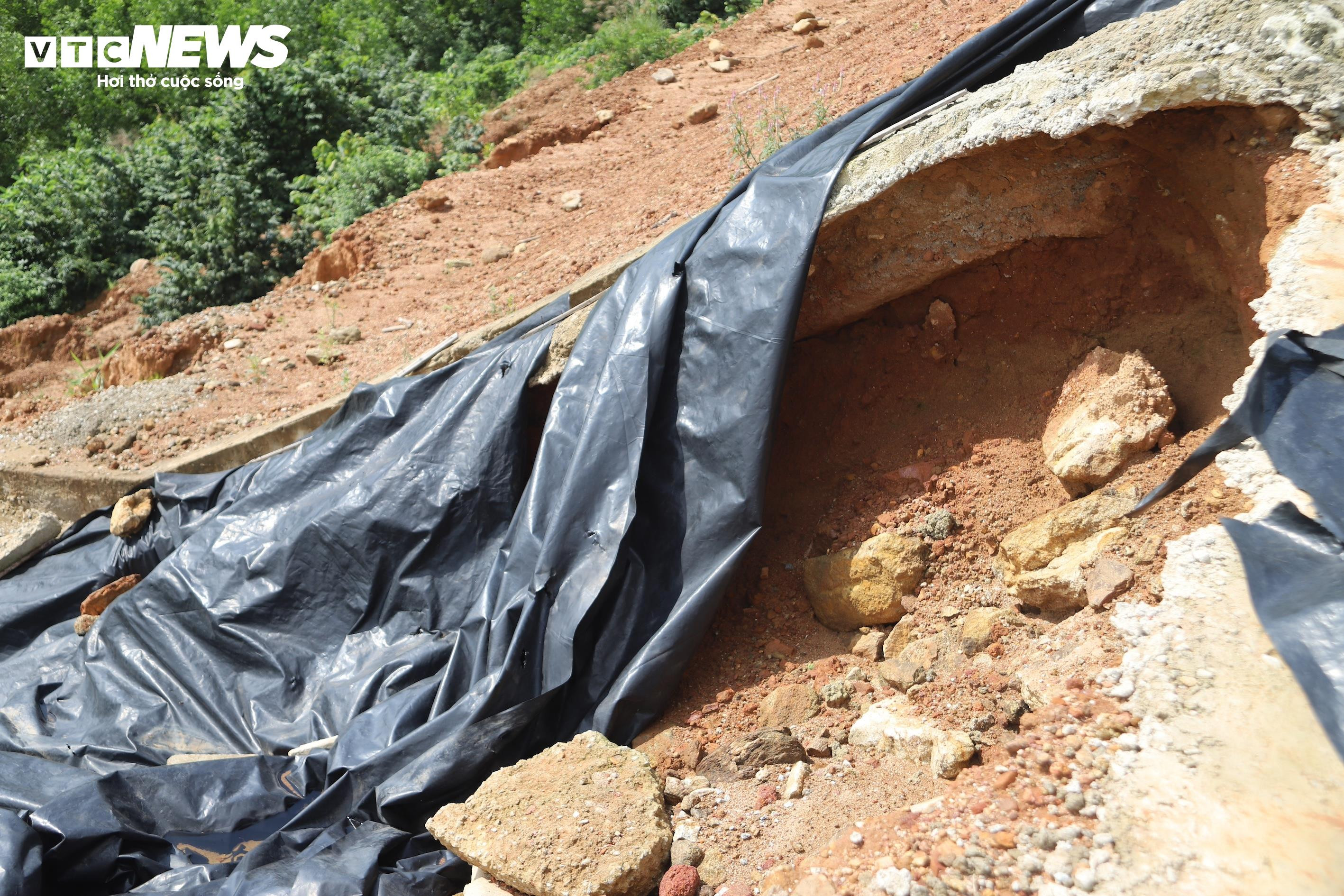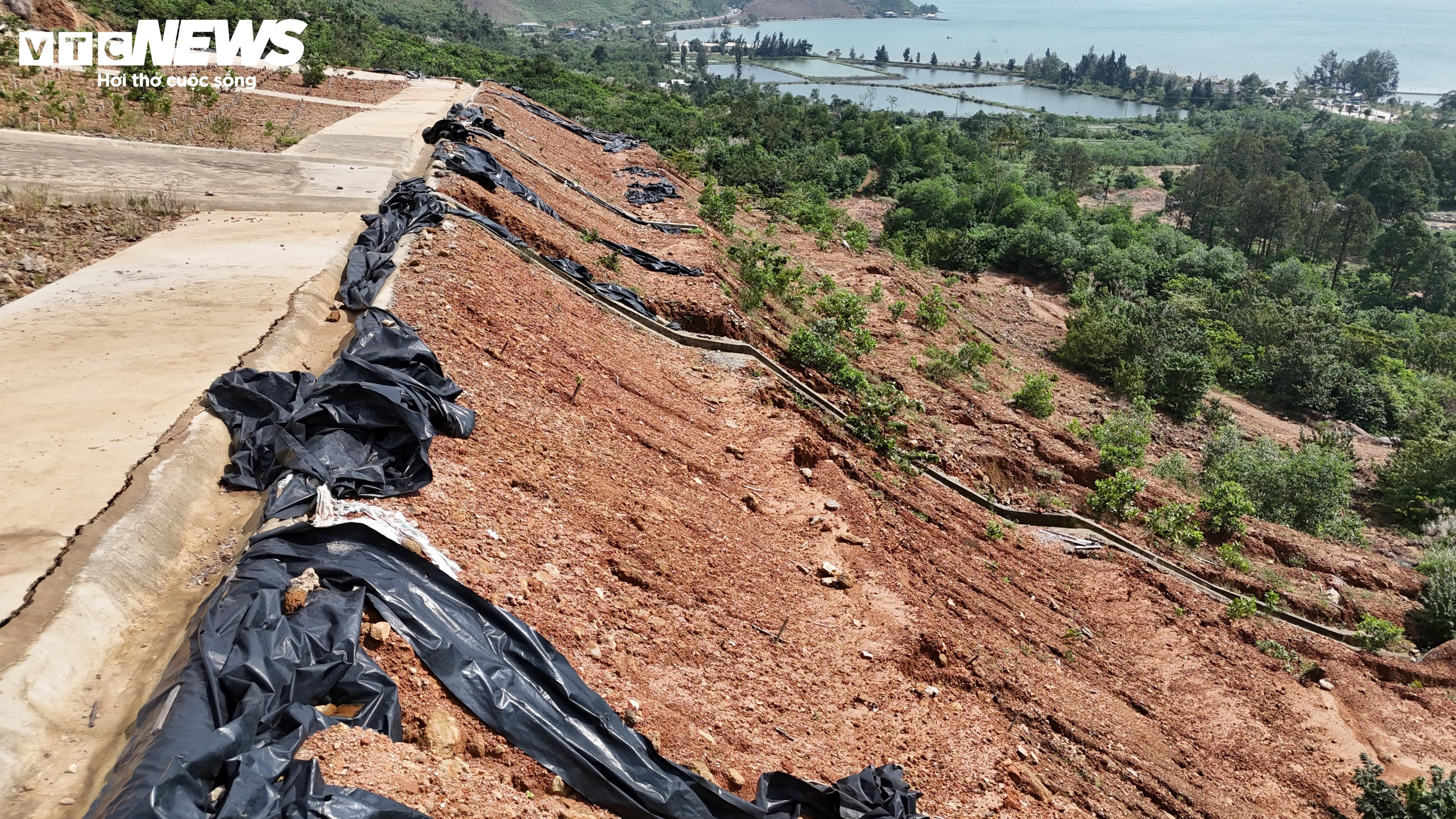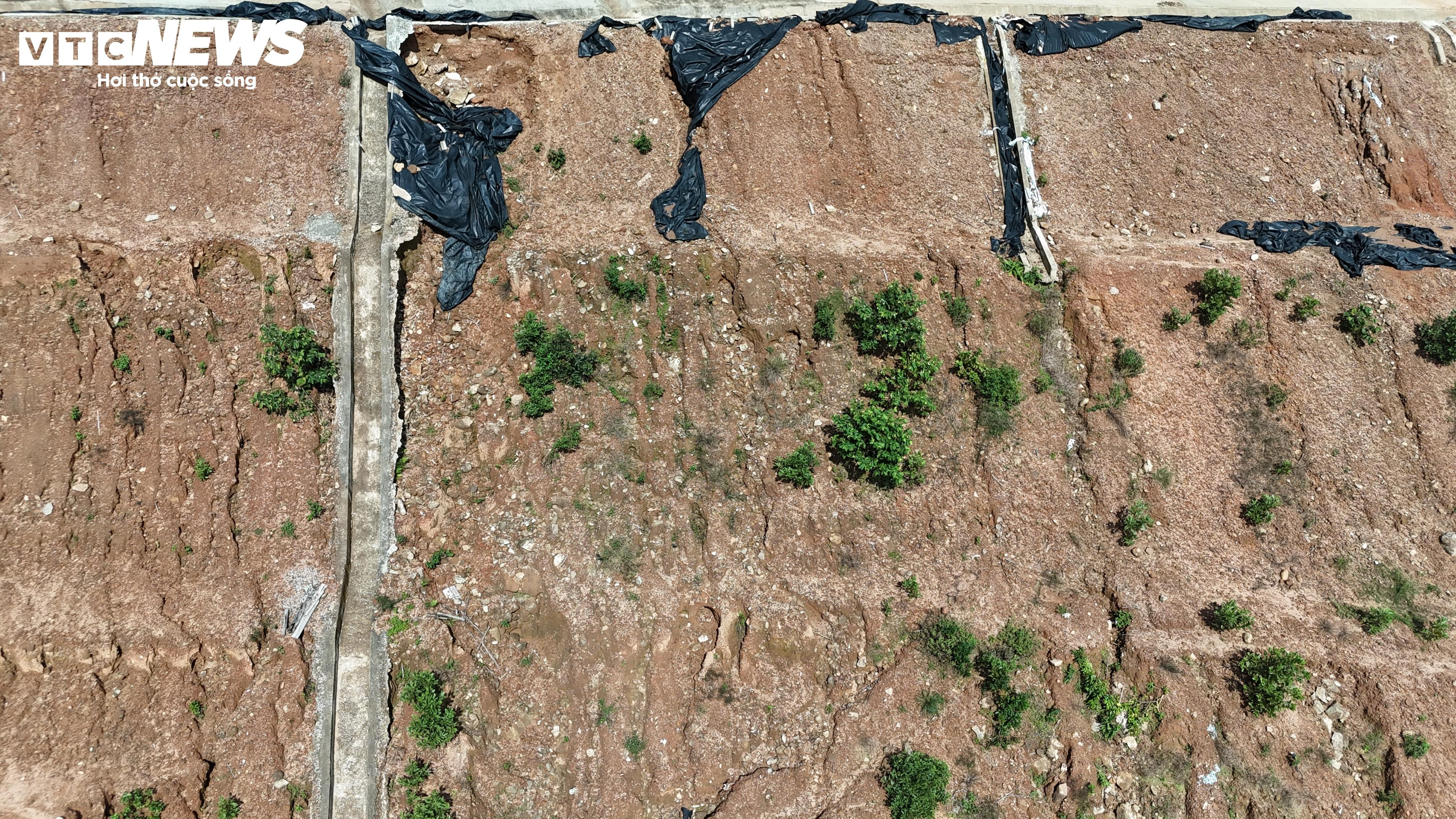 Nhiều đoạn taluy âm ở dự án nghĩa trang nhân dân Trường Đồng bị xói lở sâu, đất đá khoét hàm ếch, các lớp bạt gia cố bong tróc.