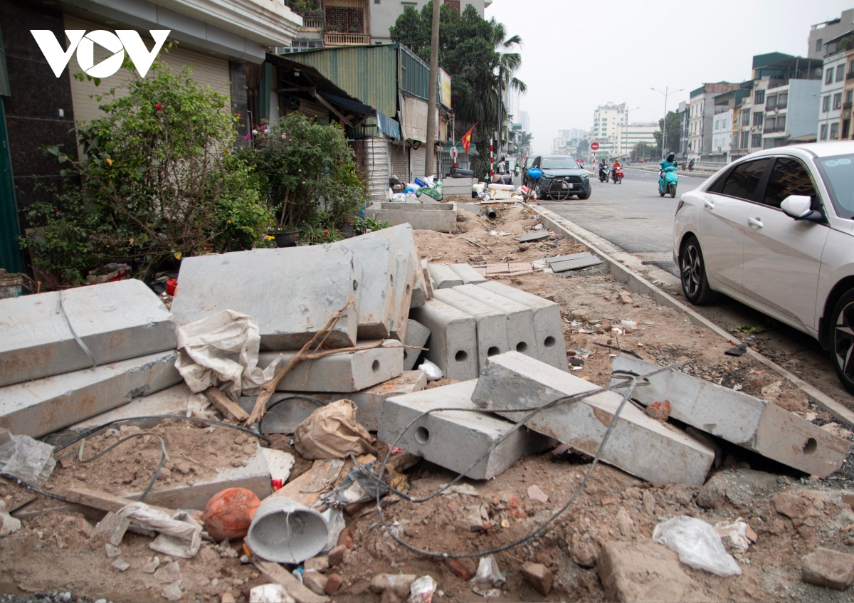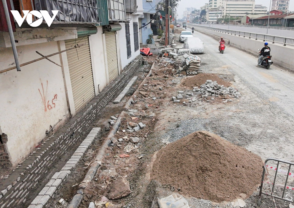Tình trạng vỉa hè ngổn ngang vật liệu xây dựng vẫn đang tiếp tục diễn ra tại khu vực đường gom phía Đầm Hồng, với nhiều đoạn bị đào xới dở dang, gạch đá, cát sỏi tập kết tràn lan, thậm chí lấn xuống lòng đường. Không ít vị trí chưa được che chắn, rào chắn còn sơ sài, tiềm ẩn nguy cơ mất an toàn cho người đi bộ và gây cản trở giao thông, đặc biệt vào giờ cao điểm.