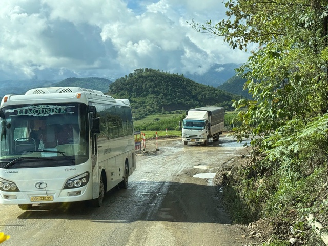 Xe khách di chuyển qua Quốc lộ 28B khi trời mưa rất khó khăn.