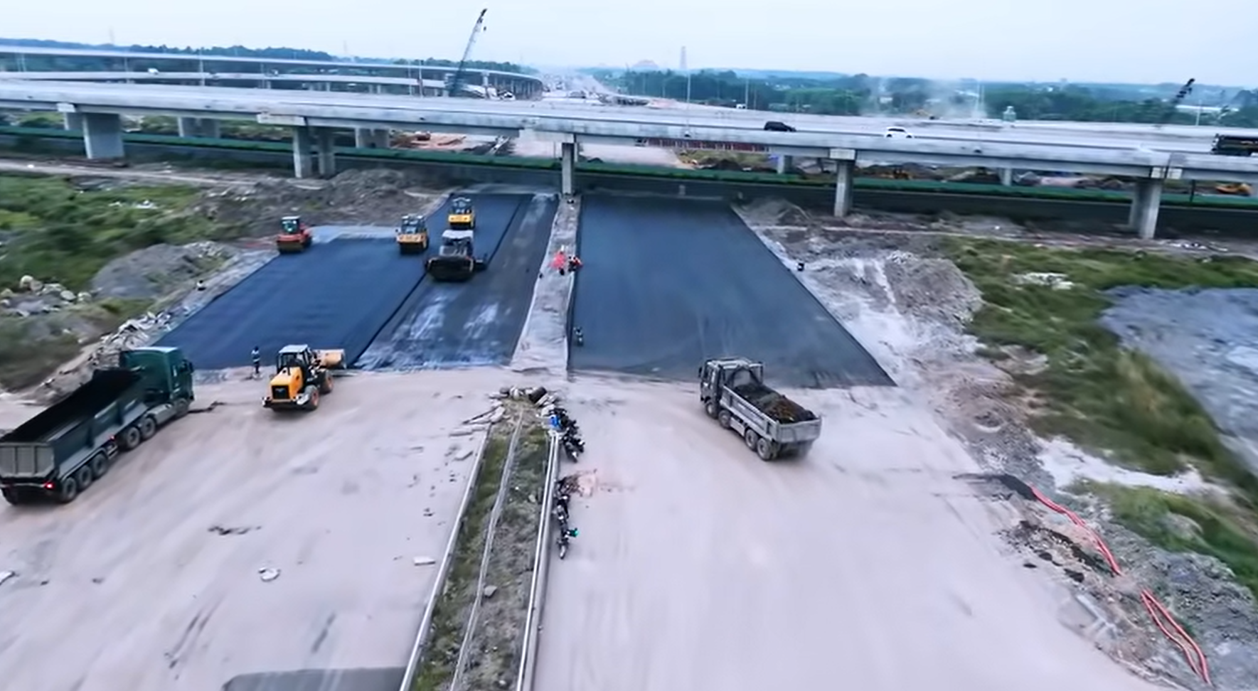 Hệ thống đường giao thông nội bộ sân bay phục vụ thi công cuốn chiếu các hạng mục và vận hành sân bay từ năm 2026 cũng đang được hoàn tất. Ảnh: Lính công trình