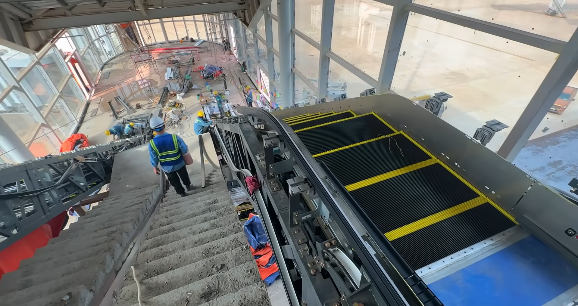 Đơn vị thi công đang lắp đặt thang cuốn lên xuống các tầng của nhà ga T1. Ảnh: Nguyễn Kiệt