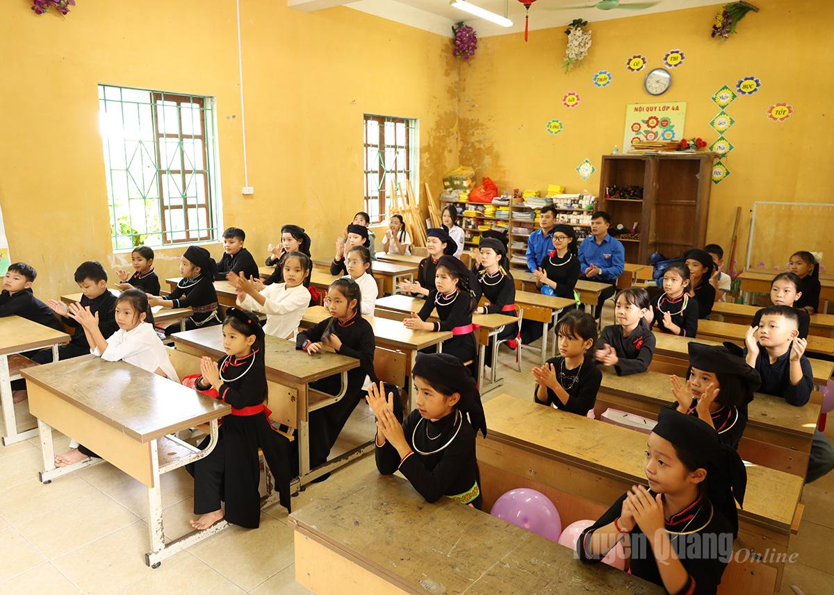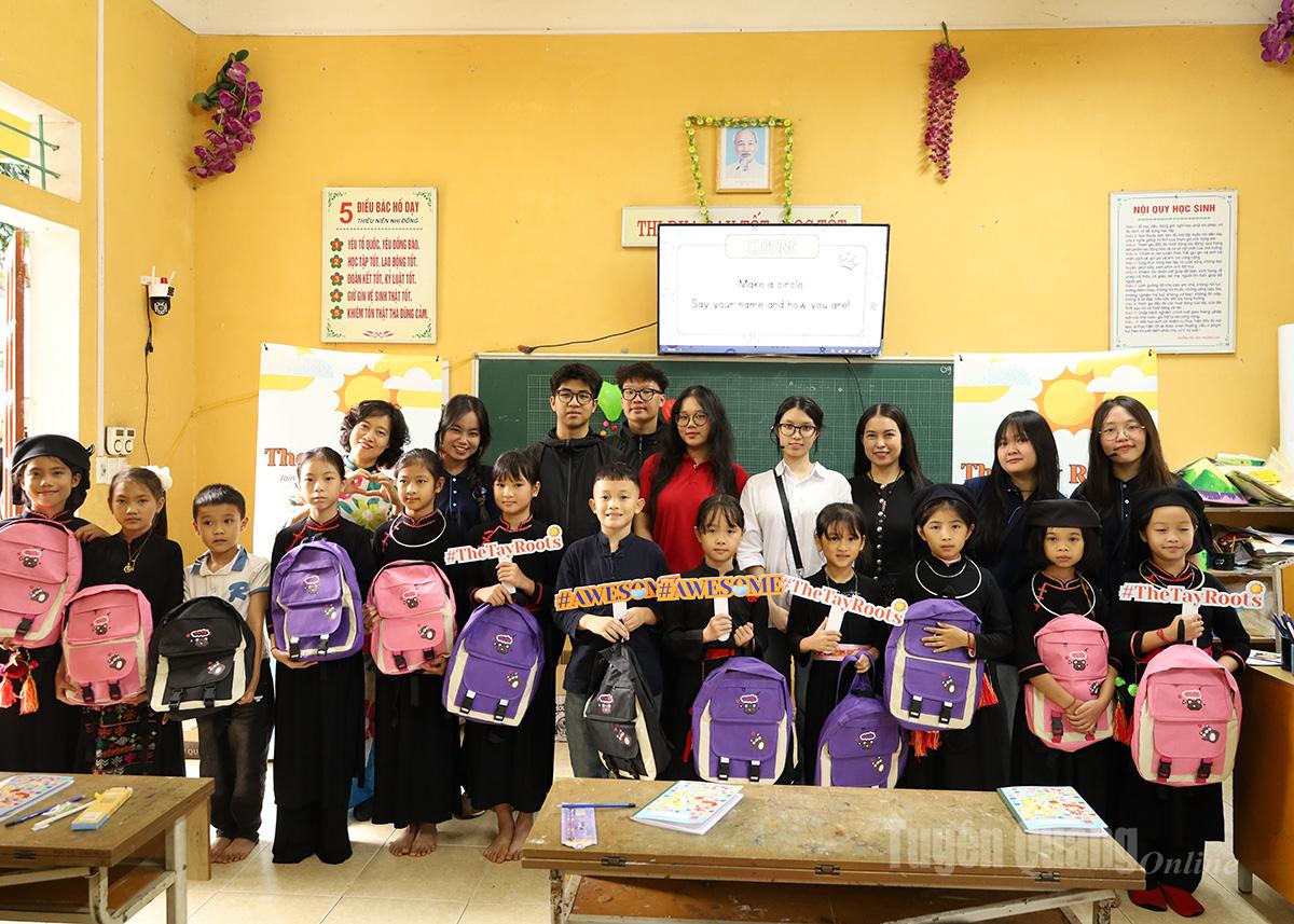 Thành viên dự án Tày Roots trao quà tặng và dụng cụ học tập cho các em học sinh xã Thượng Lâm.