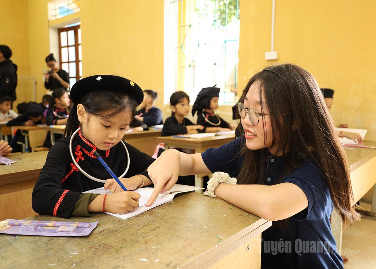 Các tình nguyện viên của Câu lạc bộ Tày Roots tận tình hướng dẫn học sinh viết và làm quen với những câu tiếng Anh cơ bản.