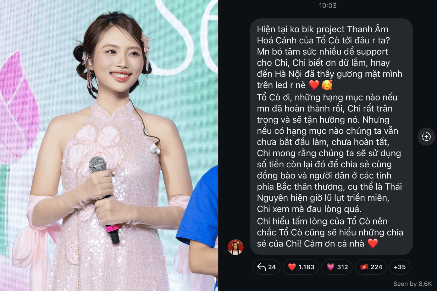 đã hỏi thăm tình hình dự án của “Tổ Cò” và gửi lời cảm ơn chân thành đến FC vì tình cảm, sự đồng hành trong thời gian qua. Đồng thời, nữ ca sĩ cũng bày tỏ mong muốn nếu những hạng mục nào của dự án chưa triển khai, FC có thể trích phần kinh phí đó để hỗ trợ người dân đang chịu ảnh hưởng nặng nề của bão lũ.