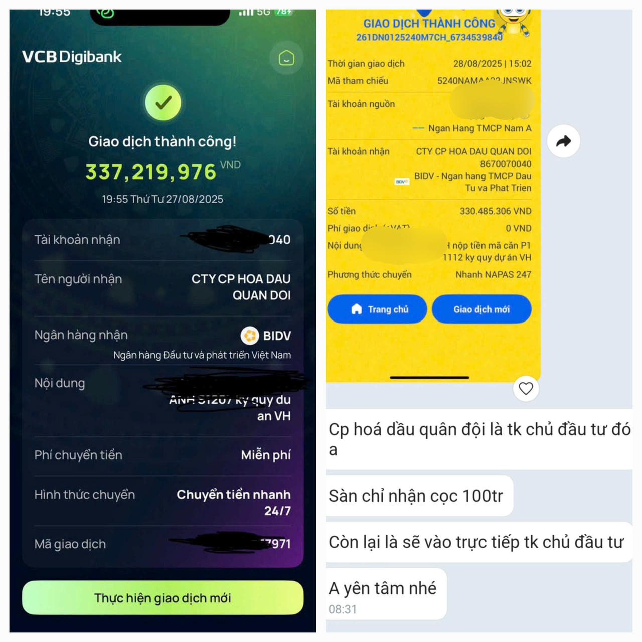 Một số khách hàng được cho đã chuyển khoản thanh toán đợt 1 tiền mua căn hộ chung cư Vinh Heritage vào số tài khoản chủ đầu tư dù dự án chưa đủ điều kiện mở bán. Ảnh chụp màn hình.