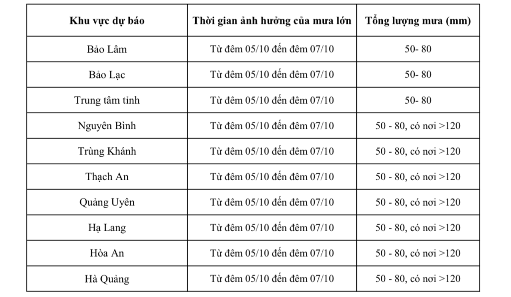 Dự báo tác động của mưa lớn:-Nguy cơ cao xảy ra sạt lở đất, đặc biệt là các khu vực có địa hình dốc. Mưa lớn có thể kèm theo các hiện tượng dông, lốc, sét, mưa đá và gió giật mạnh làm gãy đổ cây cối, hư hại nhà cửa, các công trình giao thông và cơ sở hạ tầng. Gây ngập úng cây trồng, làm đất trở nên bão hòa nước, hoặc làm cây bị đổ gây thiệt hại cho mùa màng. Gây ách tắc giao thông do ngập úng đường và giảm tầm nhìn khi lái xe, gây ra trơn trượt và tai nạn giao thông.