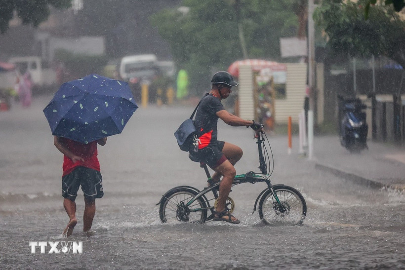 Cảnh ngập lụt sau những trận mưa lớn do ảnh hưởng của bão Wipha tại Quezon, Philippines. (Ảnh: THX/TTXVN)