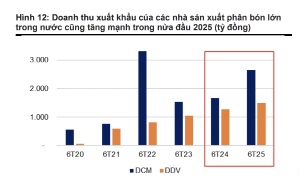 Do giá phân bón nội địa có tương quan với giá thế giới, lợi nhuận của các nhà sản xuất phân bón trong nước tăng mạnh trong nửa đầu 2025 nhờ giá bán tăng giúp mở rộng biên lợi nhuận gộp và sản lượng tiêu thụ tăng.
