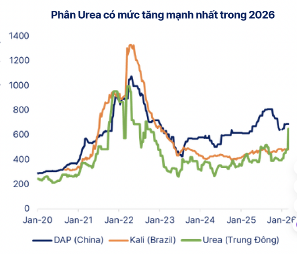 Ở trong nước, dưới tình hình căng thẳng địa chính trị như hiện nay, giá phân bón được dự báo sẽ tiếp tục tăng mạnh trong nửa đầu năm 2026, sau đó neo ở mức nền cao, do: Ấn Độ tiếp tục mở thầu mua 1,5 triệu tấn Ure trước 03/2026 và nhu cầu phân bón ở nước này vẫn duy trì khá cao.