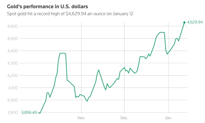 Theo thông tin từ Reuters, giá vàng giao ngay đã đạt mức 4.629,94 USD/ounce trong phiên giao dịch ngày 19/1/2026. Kim loại này đã tăng giá hơn 6% chỉ trong 2 tuần đầu tiên của năm 2026, sau khi vượt qua nhiều cột mốc và tăng 64% vào năm ngoái.