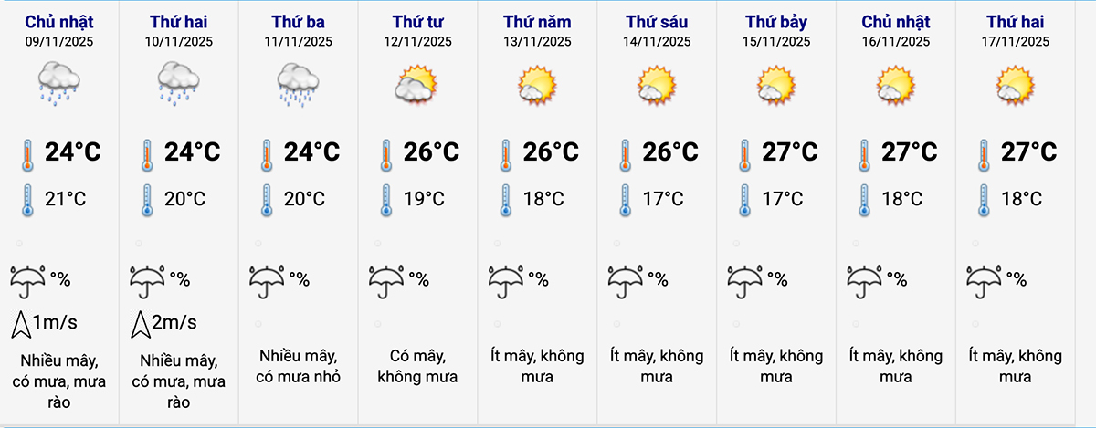 Theo bảng dự báo thời tiết 10 ngày tới, Hà Nội duy trì thời tiết có mưa từ nay đến 11/11, nhiệt độ thấp nhất về đêm và sáng sớm phổ biến 20-21°C, cao nhất 24°C.