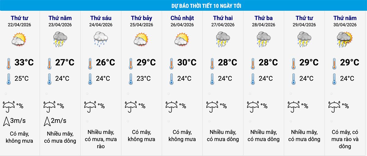 Cụ thể, ngày mai 22/4, khu vực này có mây, không mưa, nhiệt độ cao nhất ngày tăng nhẹ lên mức 33°C, nhiệt độ thấp nhất 26°C.