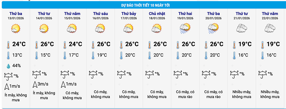 Ngoài ra, theo bảng cập nhật nhiệt độ và thời tiết 10 ngày tới ở trung tâm TP Hà Nội, ngày 14/1, cường độ không khí lạnh tiếp tục suy yếu, khu vực này tăng nhiệt, cao nhất 26°C, thấp nhất 15°C, trời ít mây, không mưa, ban ngày nắng hanh.