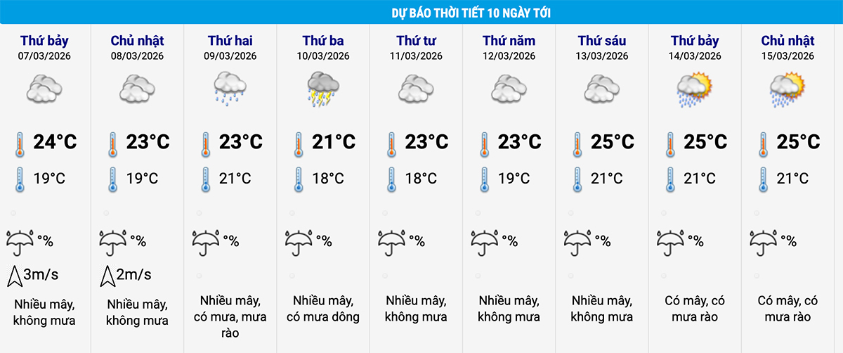 Trong hai ngày 11-12/3, khu vực này mặc dù nhiều mây nhưng không mưa, nhiệt độ cao nhất tăng nhẹ lên 23°C, nhiệt độ thấp nhất dao động 18-19°C.