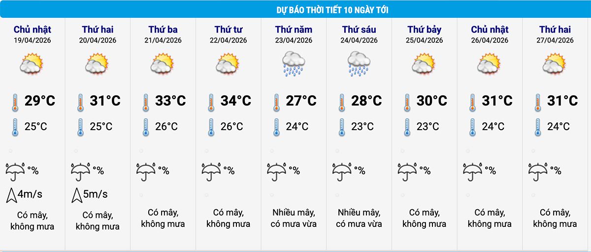 Ngày 20/4, khu vực này duy trì hình thái thời tiết có mây, không mưa, nhiệt độ cao nhất trong ngày tăng lên ngưỡng 31°C, thấp nhất 25°C.
