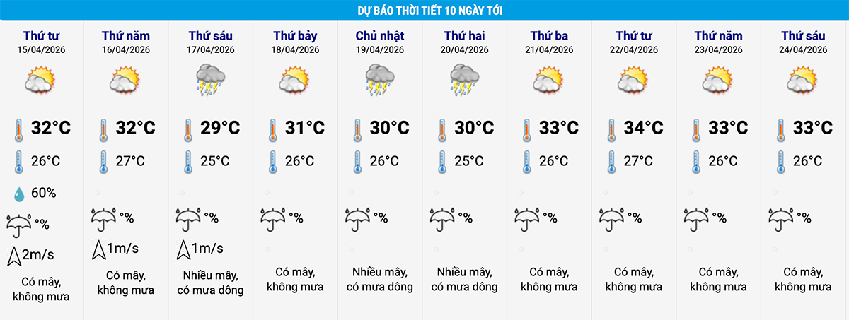 Ngày 15/4, Hà Nội ngày nắng, đêm không mưa với nhiệt độ thấp nhất 26-28°C, cao nhất 32-34°C.