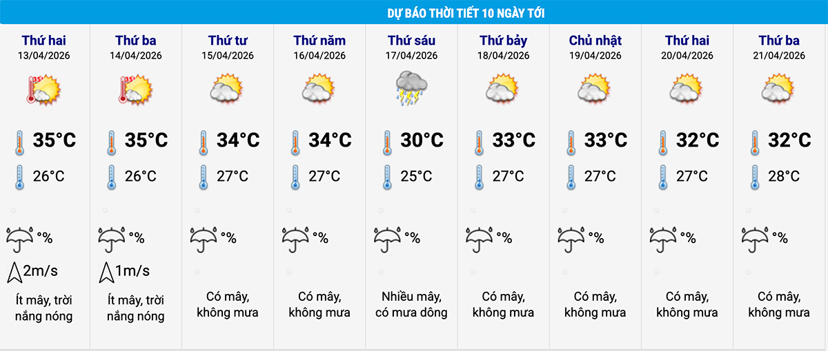 Theo bảng cập nhật thời tiết và nhiệt độ 10 ngày tới, nắng nóng duy trì ở Hà Nội trong ngày 13-14/4 với nhiệt độ cao nhất ngày 35°C, thấp nhất 26°C.