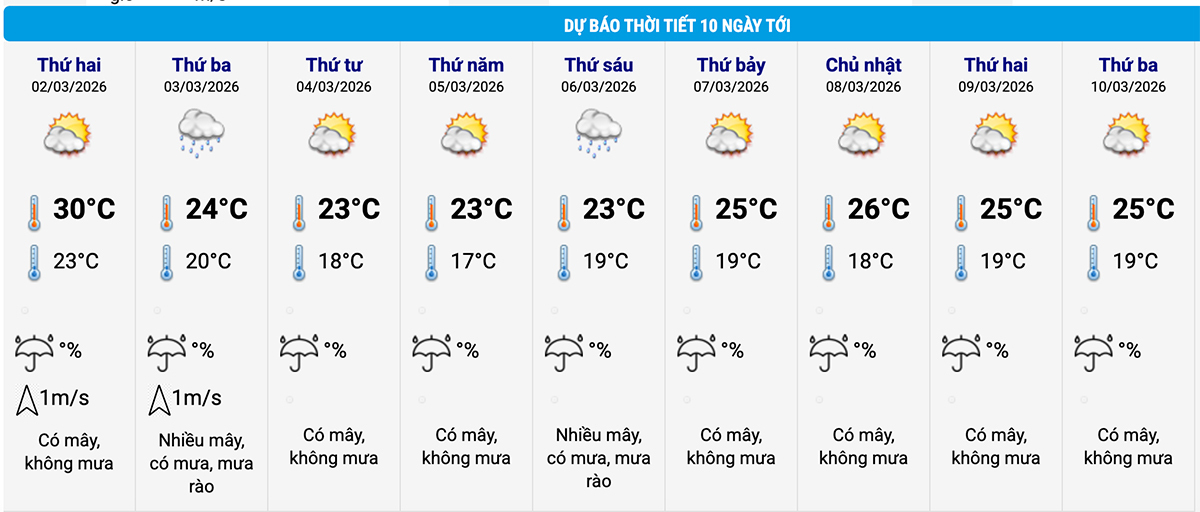 Hôm nay 1/3, Hà Nội mưa vài nơi, mưa dồn nhiều vào buổi sáng, trưa chiều giảm mây trời nắng. Gió đông nam đến nam cấp 2-3. Nhiệt độ thấp nhất 23-25°C, nhiệt độ cao nhất 29-31°C.