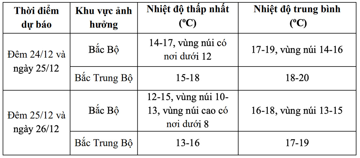 Ngày 25/12, Bắc Bộ, Thanh Hóa và Nghệ An có mưa, mưa rào và có nơi có dông, trời chuyển rét, vùng núi Bắc Bộ rét đậm, có nơi rét hại. Trong đó, nhiệt độ cao nhất ở Hà Nội và Đông Bắc Bộ dao động 17-20°C, giảm khoảng 7°C so với ngày hôm trước; Tây Bắc Bộ 18-21°C, có nơi trên 22°C.