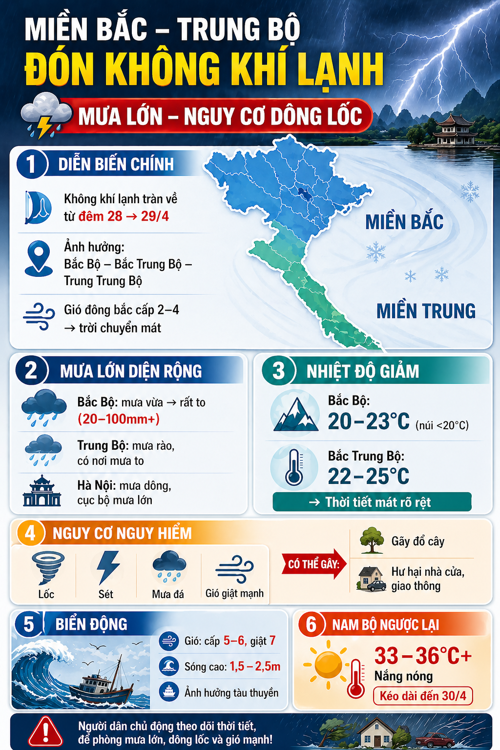 Ngày 29/4, không khí lạnh ảnh hưởng đến Đông Bắc Bộ, Bắc Trung Bộ, một số nơi ở Tây Bắc Bộ và Trung Trung Bộ. Trên đất liền, gió chuyển hướng đông bắc cấp 2-3, vùng ven biển cấp 3-4. Đông Bắc Bộ và Bắc Trung Bộ trời chuyển mát.