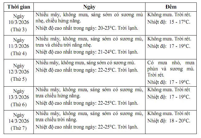 Từ ngày 13/3/2026 - 15/3/2026: Nhiều mây, đêm và sáng có sương mù và sương mù nhẹ, mưa xuất hiện vài nơi, trưa và chiều trời tạnh ráo; nhiệt độ thấp nhất đêm và sáng 17-19°C, cao nhất ban ngày khoảng 22-25°C.