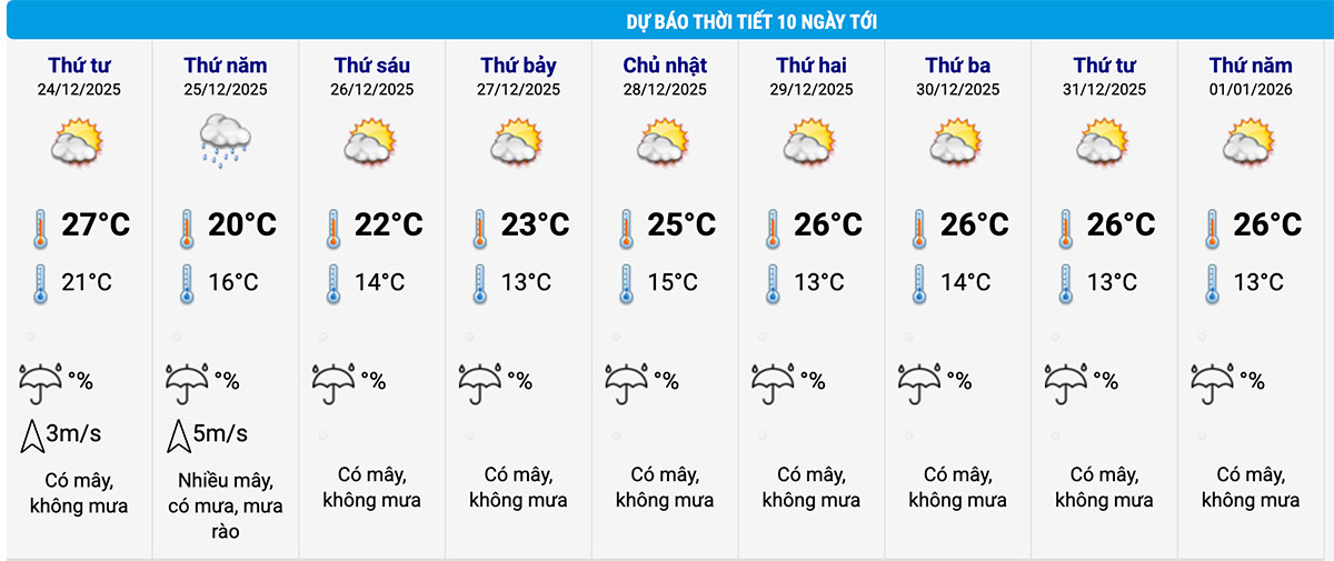Từ 28/12 đến Tết Dương lịch 1/1/2026, thời tiết khu vực duy trì không mưa, nhiệt độ cao nhất trong ngày xu hướng tăng nhẹ, cao nhất 25-26°C nhưng ban đêm trời vẫn rét sâu, thấp nhất 13-15°C khiến chênh lệch nhiệt độ giữa ngày và đêm vẫn tương đối cao.