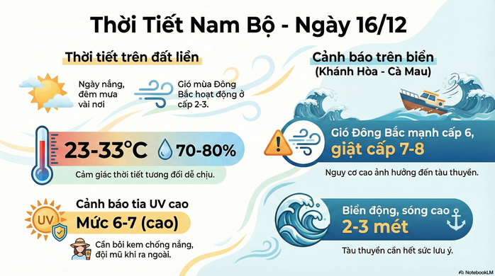 Trung tâm Dự báo Khí tượng Thủy văn Quốc gia dự báo thời tiết hôm nay, ngày 16-12 tại các tỉnh Nam Bộ phổ biến có mây, ban ngày nắng; ban đêm có mưa vài nơi, chủ yếu ở khu vực miền Tây. Riêng TPHCM đêm không mưa. Gió mùa Đông Bắc hoạt động ở cấp 2-3.