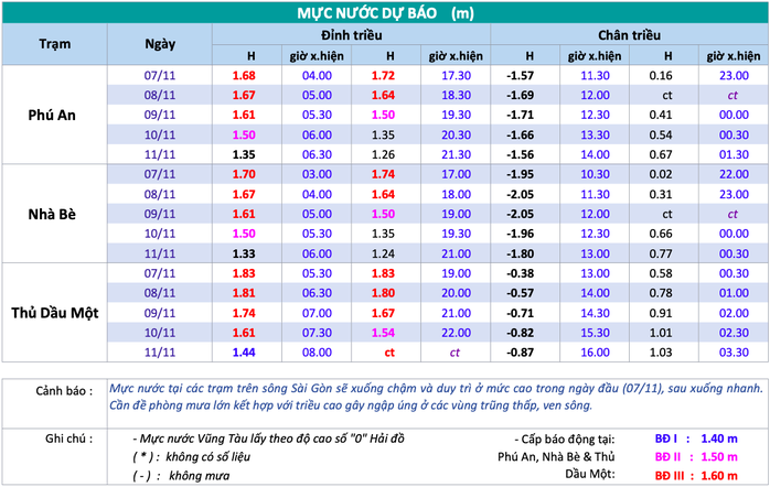 Bảng dự báo triều cường ở TPHCM từ ngày 7 đến ngày 11-11. Nguồn: Đài Khí tượng Thủy văn Nam Bộ