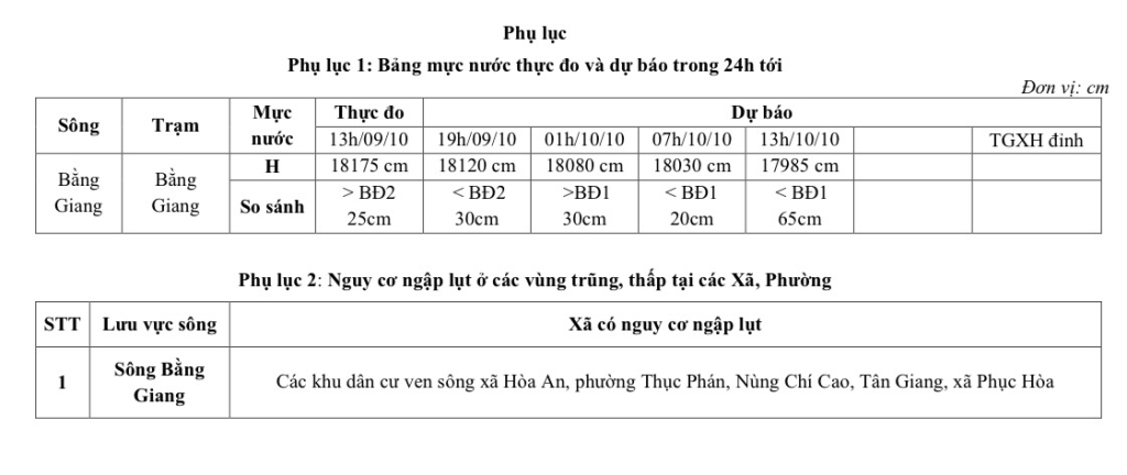 Xảy ra ngập lụt tại các vùng trũng thấp, ven sông suối, các khu dân cư, các khu đô thị ven sông Bằng giang ; nguy cơ sạt lở đất nơi có địa hình dốc, khu vực có kết cấu đất đá yếu, kém ổn định, các công trình xây dựng, các khu bờ, bãi sông do đã có lượng mưa lớn.
