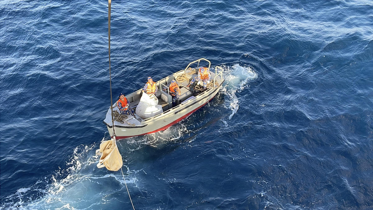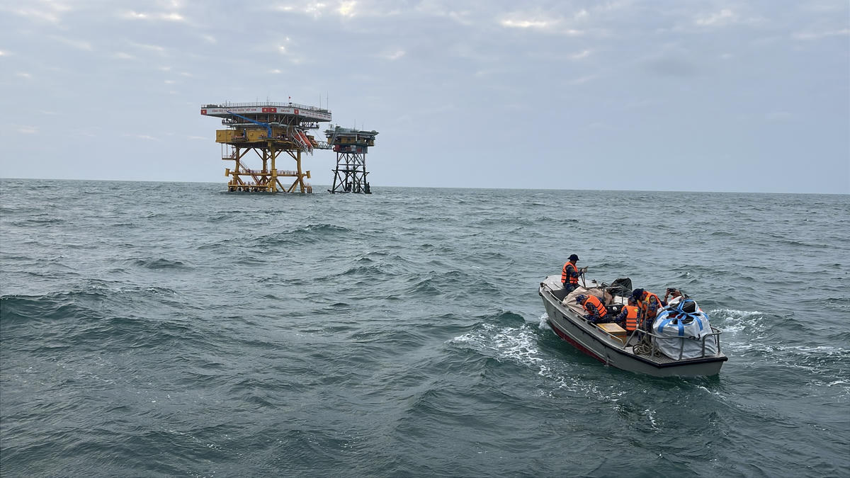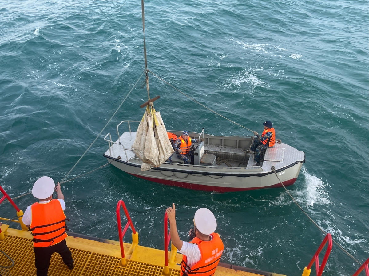 Hàng hóa được vận chuyển từ tàu lớn sang ca nô nhỏ để chuẩn bị tiếp cận nhà giàn. Ảnh: Đoàn Xá.