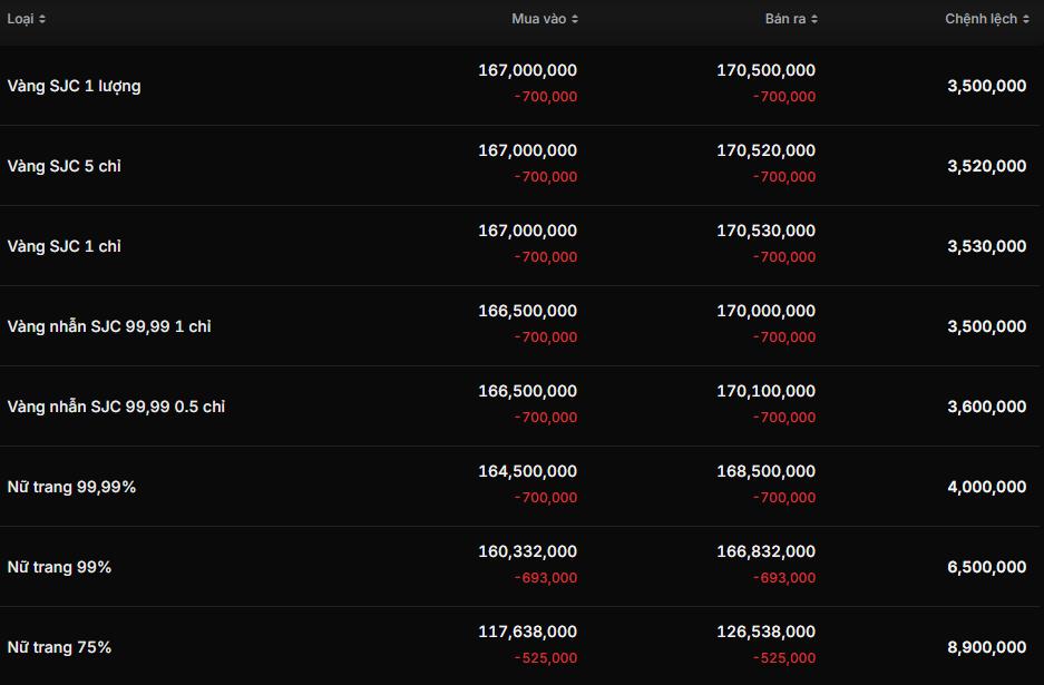 Cụ thể, các thương hiệu như DOJI, SJC, Phú Quý, Bảo Tín Minh Châu đều hạ giá bán ra quanh mức 167 – 170,5 triệu đồng/lượng mua vào và bán ra. Đáng chú ý, khoảng cách mua bán dao động từ 3,5 triệu đồng/lượng, cao hơn so với thời điểm trước vài trăm ngàn đồng. Riêng cửa hàng Mi Hồng vẫn giữ khoảng cách 2 triệu đồng/lượng, còn thương hiệu PNJ chênh lệch cao nhất với 4 triệu đồng/lượng.