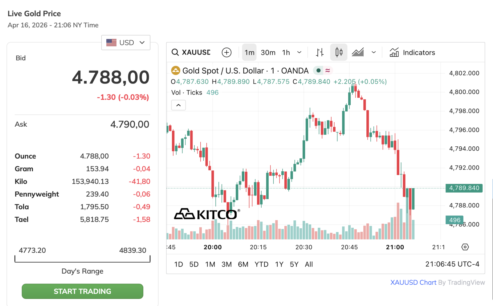 Theo dữ liệu từ trang Kitco.com, vào lúc 21 giờ 6 phút ngày 16/4 (giờ New York), tức 8 giờ 6 phút ngày 17/4 (giờ Việt Nam), giá vàng giao ngay đạt 4.788 USD/ounce, giảm 1,30 USD, khoảng 0,03% so với phiên trước đó. Trong phiên, giá dao động trong biên độ khá rộng từ 4.773 USD đến 4.839 USD/ounce, phản ánh trạng thái giằng co khi lực mua và bán liên tục thay đổi.