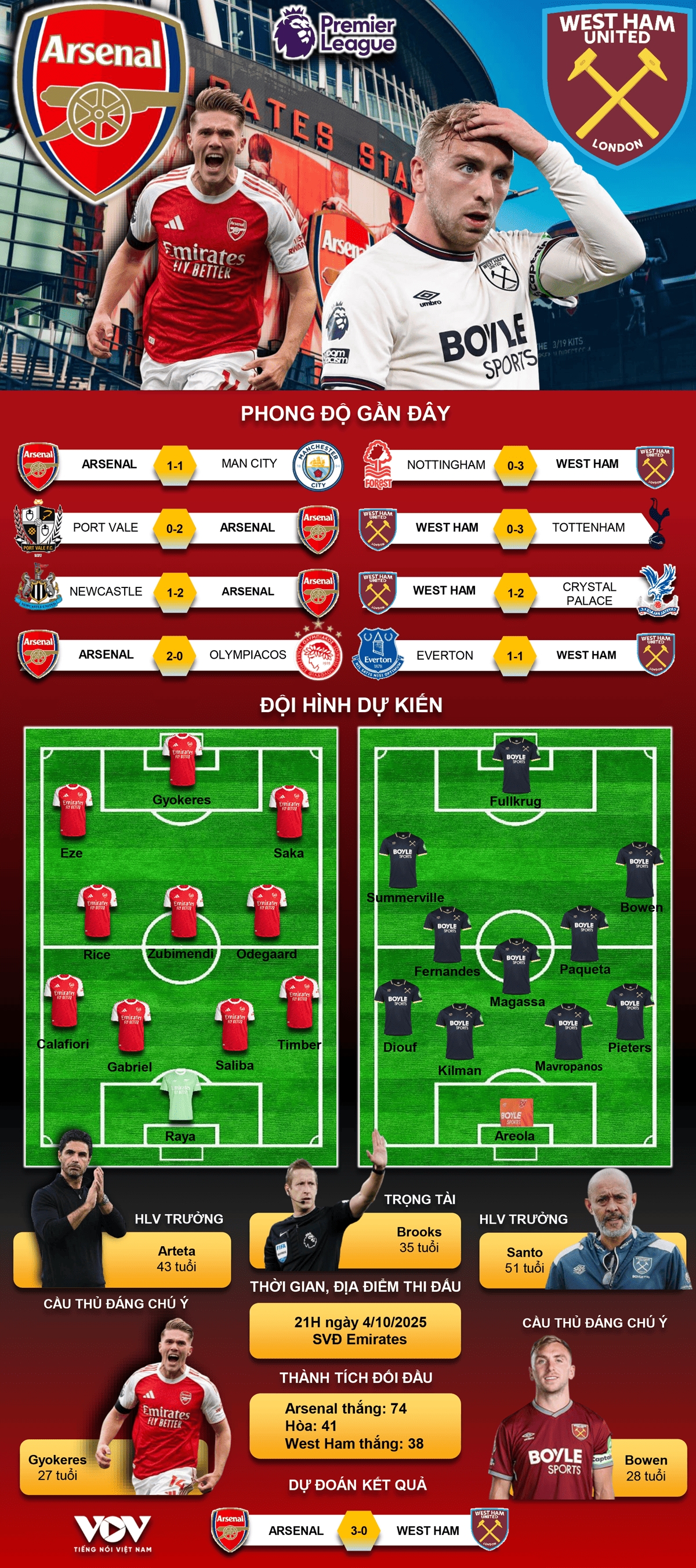 Dự đoán kết quả và đội hình ra sân trận Arsenal vs West Ham, vòng 7 Ngoại hạng Anh 2025/2026 diễn ra lúc 21h ngày 4/10/2025.