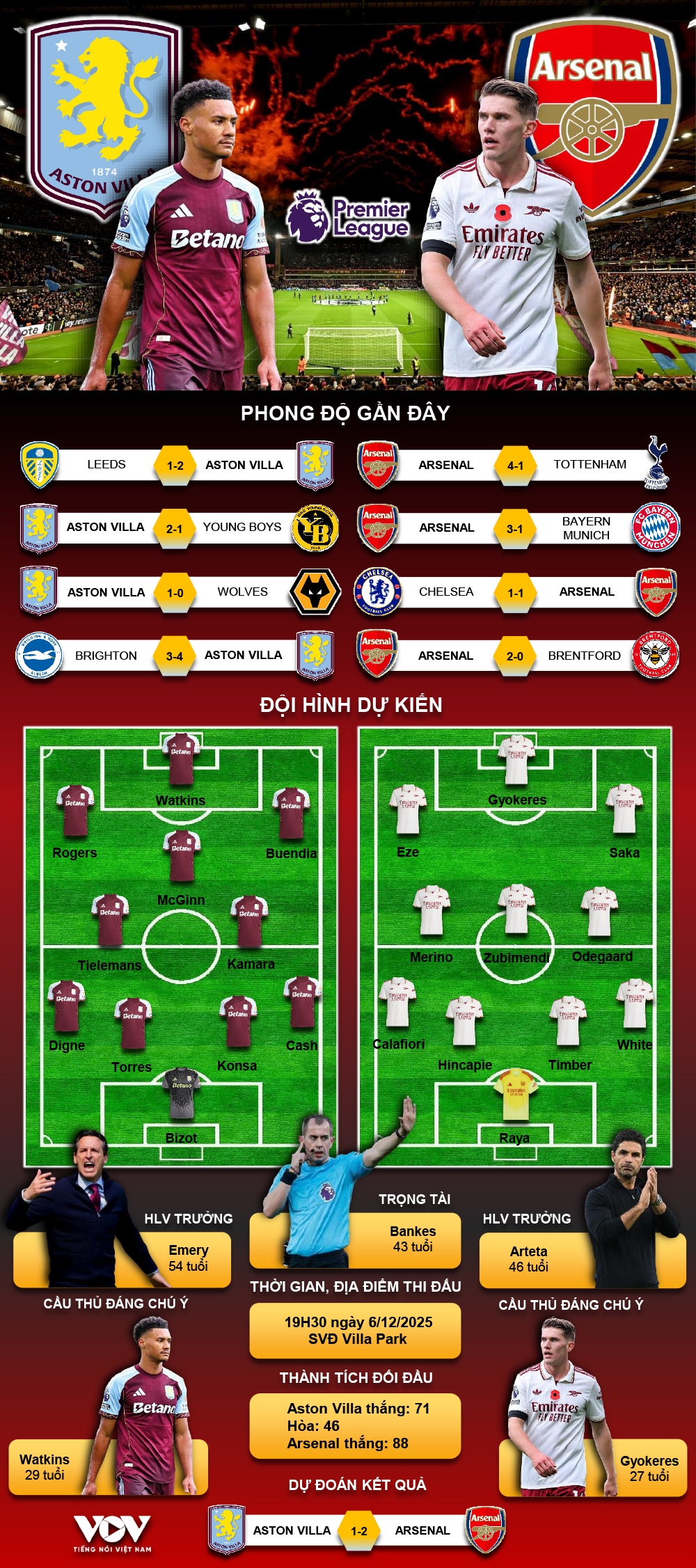 Dự đoán kết quả và đội hình ra sân trận Aston Villa vs Arsenal thuộc khuôn khổ vòng 15 Ngoại hạng Anh 2025/2026 diễn ra vào lúc 19h30 ngày 6/12.