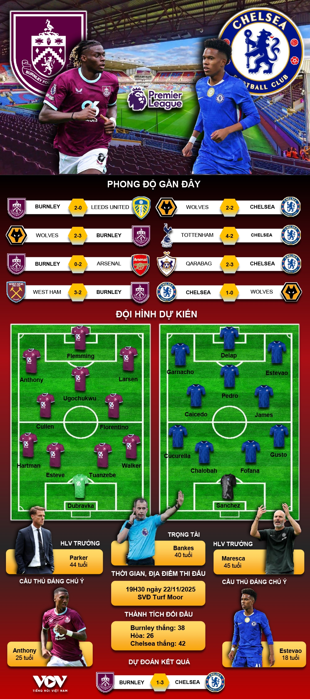 Dự đoán kết quả và đội hình ra sân trận Burnley vs Chelsea thuộc khuôn khổ vòng 12 Ngoại hạng Anh 2025/2026 diễn ra vào lúc 19h30 ngày 22/11.
