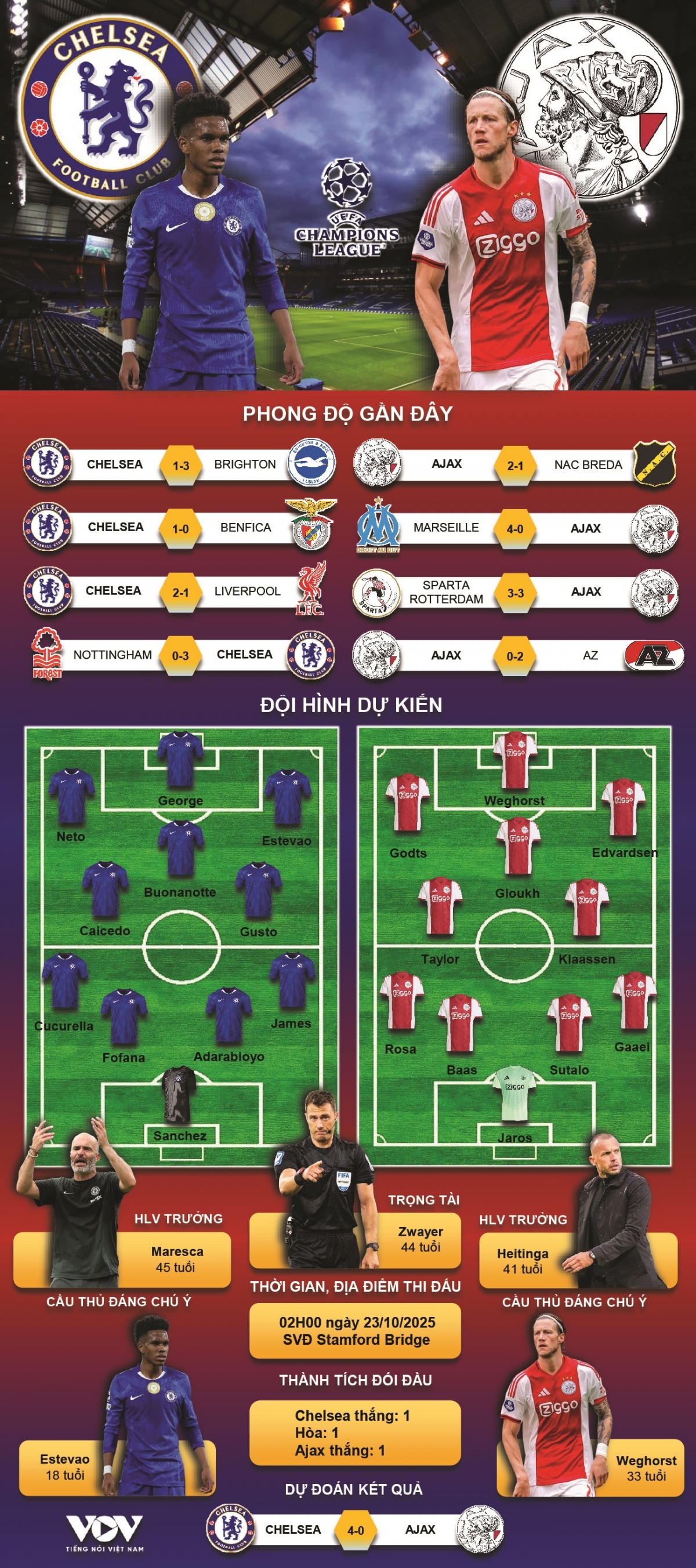 Dự đoán kết quả và đội hình ra sân trận Chelsea vs Ajax thuộc khuôn khổ vòng bảng Cúp C1 châu Âu 2025/2026 diễn ra vào lúc 02h00 ngày 23/10.