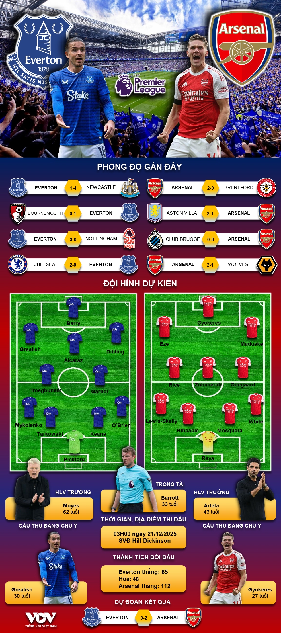Dự đoán kết quả và đội hình ra sân trận Everton vs Arsenal thuộc khuôn khổ vòng 17 Ngoại hạng Anh 2025/2026 diễn ra vào lúc 03h00 ngày 21/12.