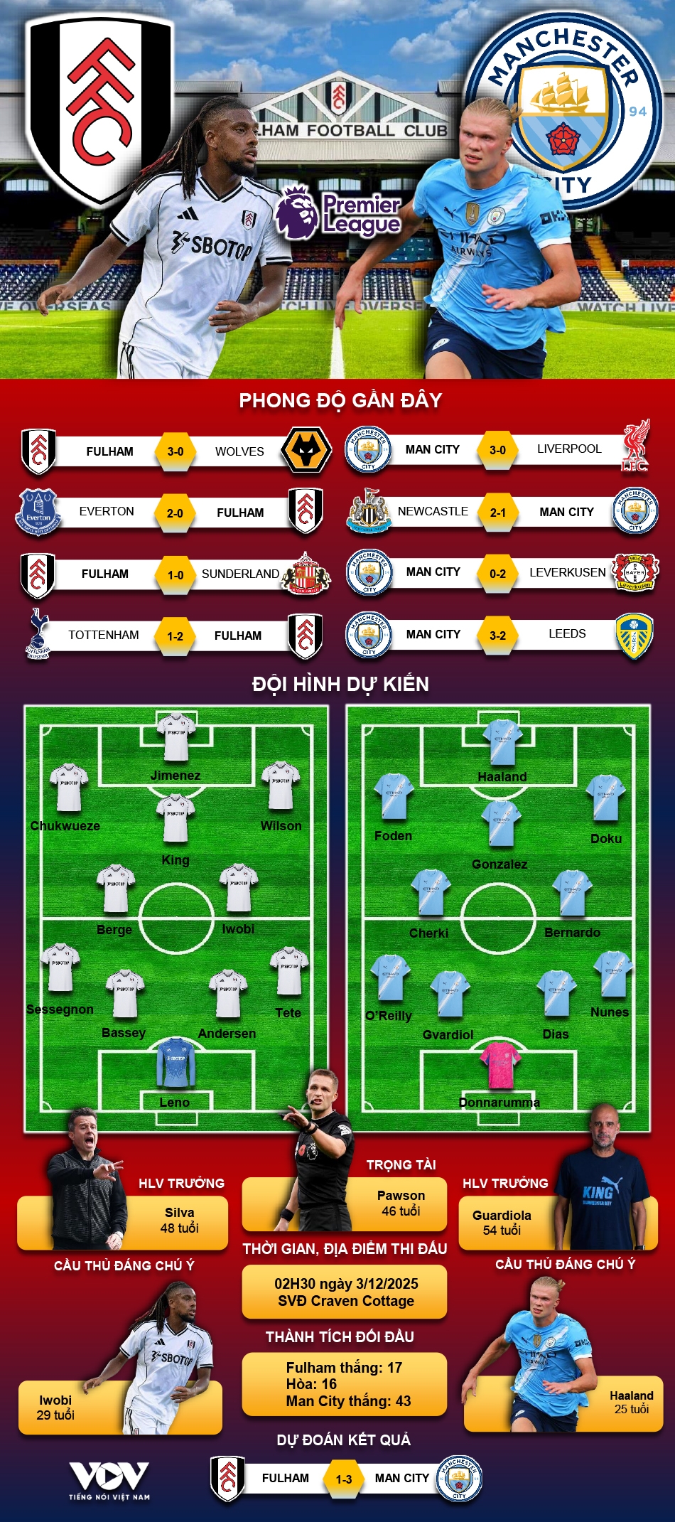 Dự đoán kết quả và đội hình ra sân trận Fulham vs Man City thuộc khuôn khổ vòng 14 Ngoại hạng Anh 2025/2026 diễn ra vào lúc 02h30 ngày 3/12.