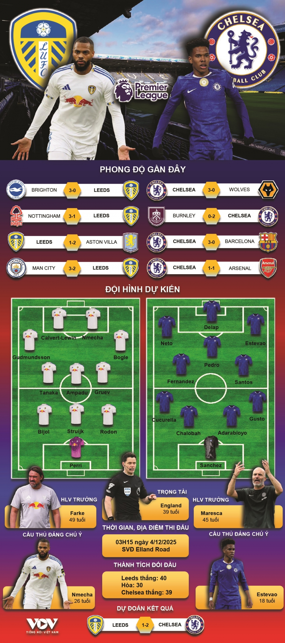 Dự đoán kết quả và đội hình ra sân trận Leeds United vs Chelsea thuộc khuôn khổ vòng 14 Ngoại hạng Anh 2025/2026 diễn ra vào lúc 03h15 ngày 4/12.