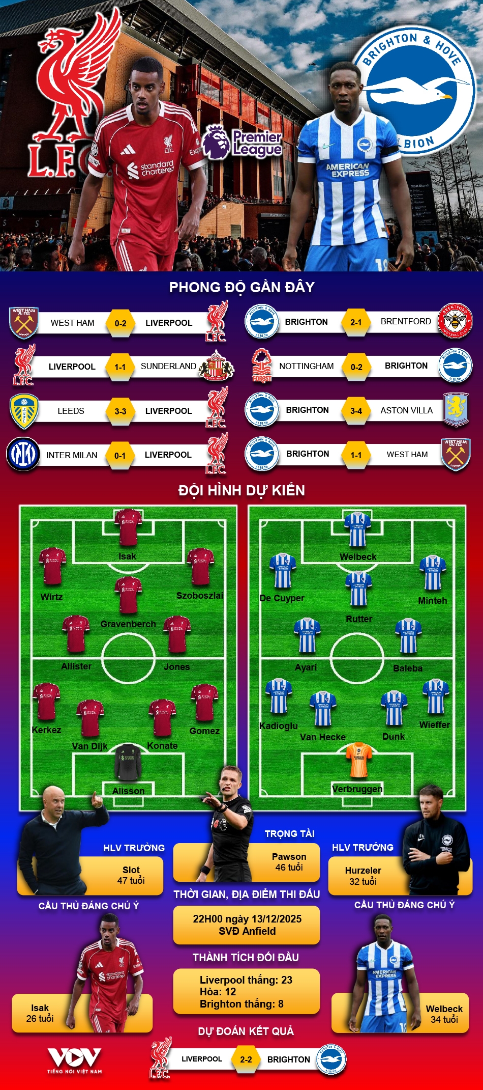 Dự đoán kết quả và đội hình ra sân trận Liverpool vs Brighton thuộc khuôn khổ vòng 16 Ngoại hạng Anh 2025/2026 diễn ra vào lúc 22h00 ngày 13/12.