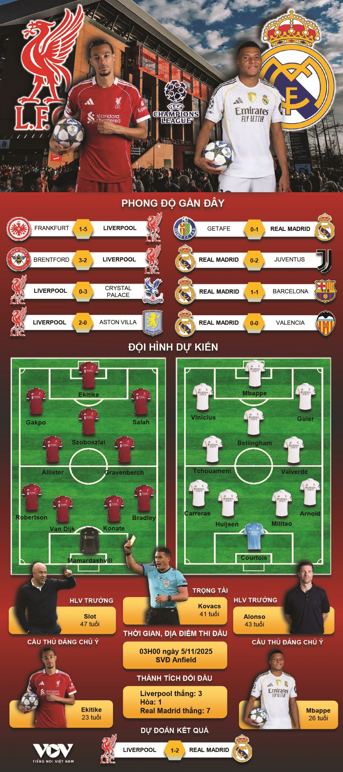 Dự đoán kết quả và đội hình ra sân trận Liverpool vs Real Madrid thuộc khuôn khổ vòng bảng Cúp C1 châu Âu 2025/2026 diễn ra vào lúc 03h00 ngày 5/11.