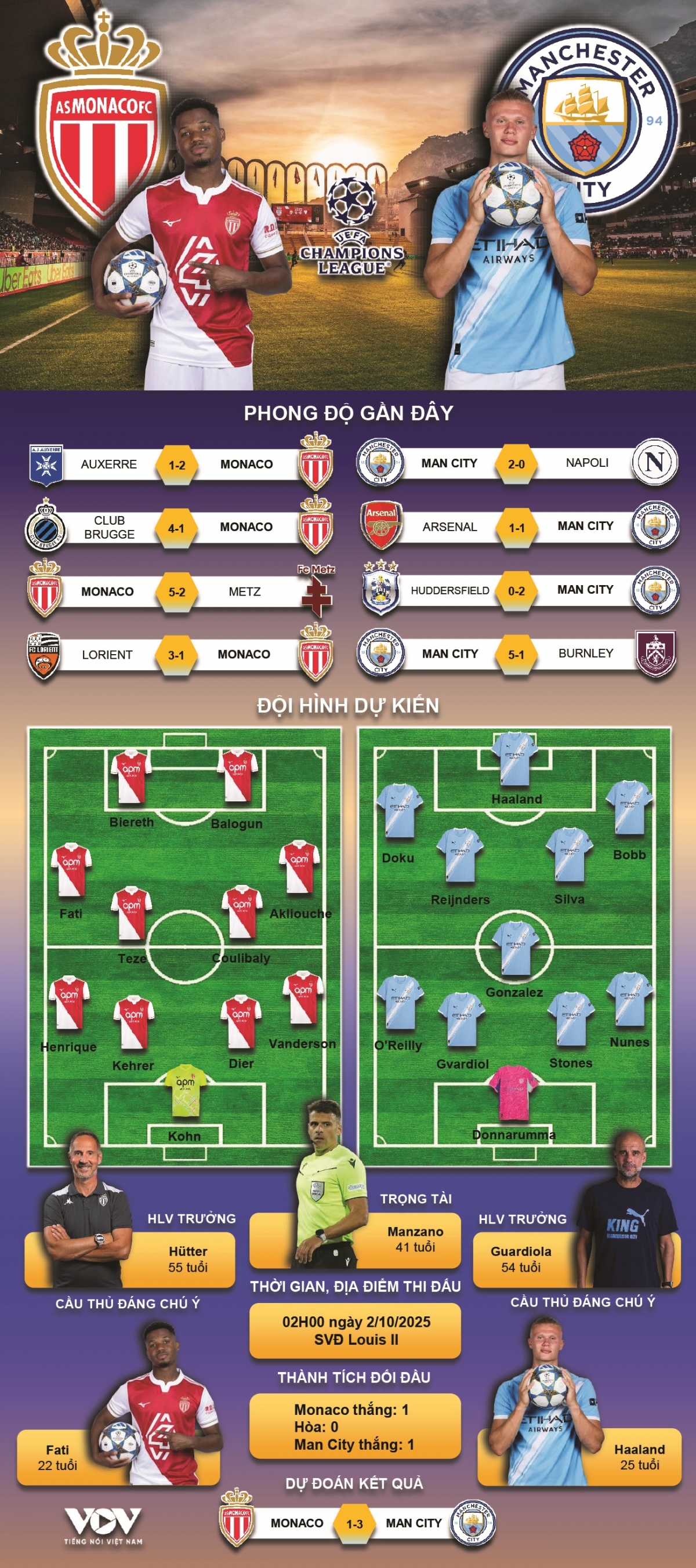 Dự đoán kết quả và đội hình ra sân trận Monaco vs Man City thuộc khuôn khổ vòng bảng Cúp C1 châu Âu 2025/2026 diễn ra vào lúc 02h00 ngày 2/10.