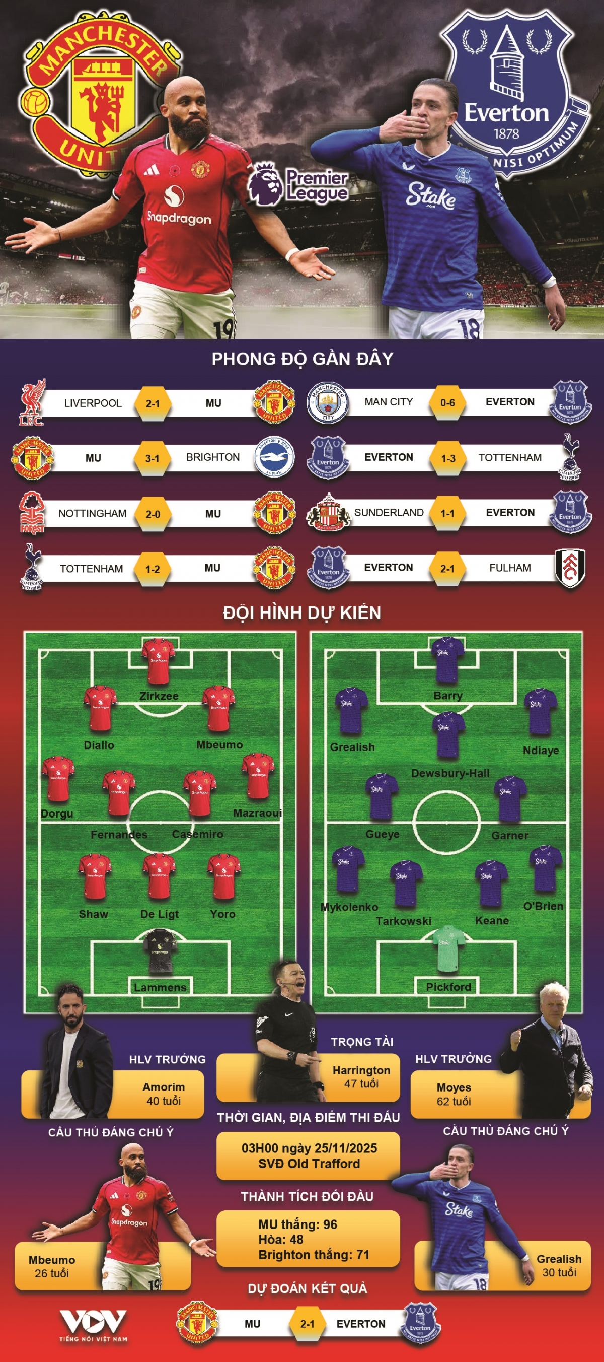 Dự đoán kết quả và đội hình ra sân trận MU vs Everton thuộc khuôn khổ vòng 12 Ngoại hạng Anh 2025/2026 diễn ra vào lúc 03h00 ngày 25/11.