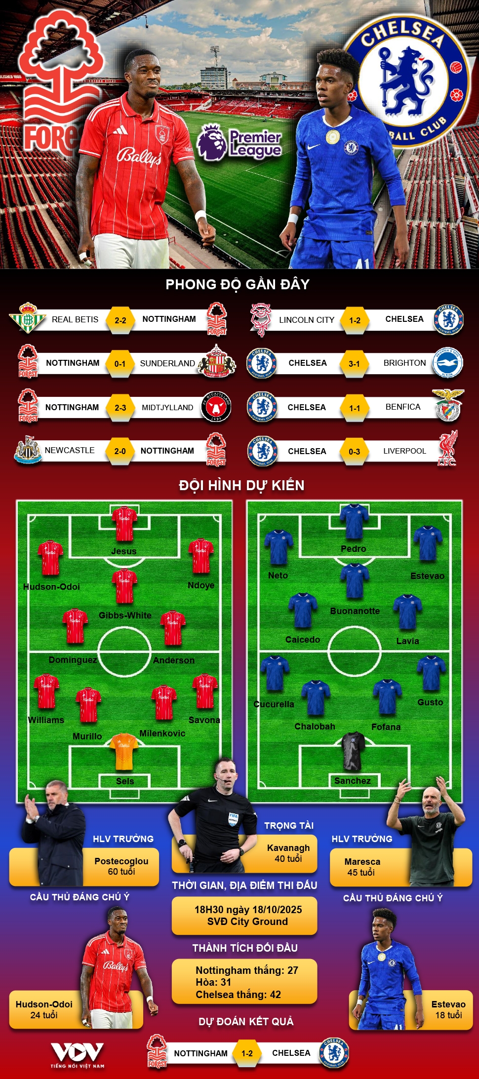 Dự đoán kết quả và đội hình ra sân trận Nottingham vs Chelsea thuộc khuôn khổ vòng 8 Ngoại hạng Anh 2025/2026 diễn ra lúc 18h30 ngày 18/10.