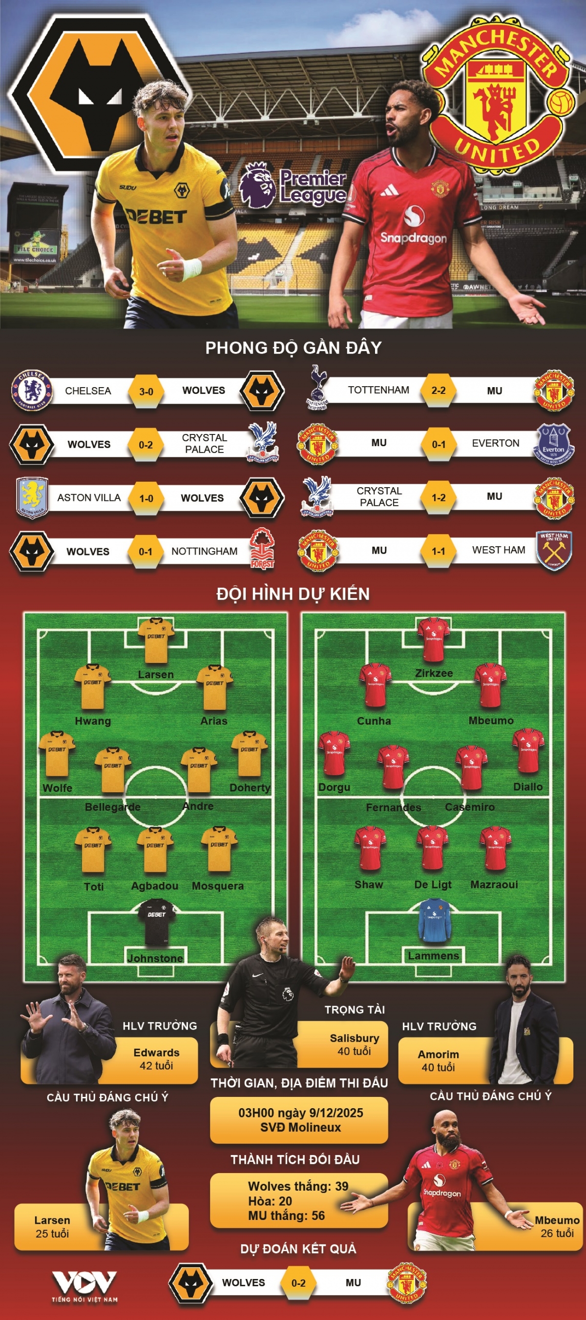Dự đoán kết quả và đội hình ra sân trận Wolves vs MU thuộc khuôn khổ vòng 15 Ngoại hạng Anh 2025/2026 diễn ra vào lúc 03h00 ngày 9/12.