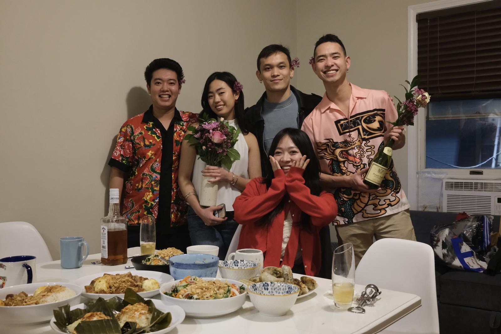 “Chúng mình nấu cả mâm cỗ với bánh chưng, nộm, chả giò, đủ hết rồi rót rượu, chơi nhạc và cắm hoa lên tai lấy hên đầu năm”, Tùng kể.